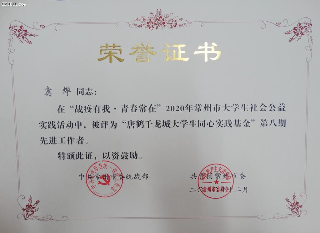 我院團(tuán)委竇燁老師榮獲“戰(zhàn)疫有我 青春常在”2020年常州市大學(xué)社會(huì)公益實(shí)踐活動(dòng)暨“唐鶴千龍城大學(xué)生同心實(shí)踐基金”第八期先進(jìn)工作者榮譽(yù)稱號(hào)。
