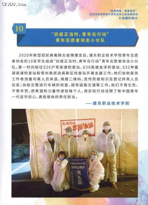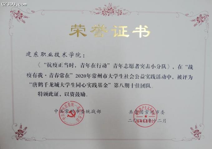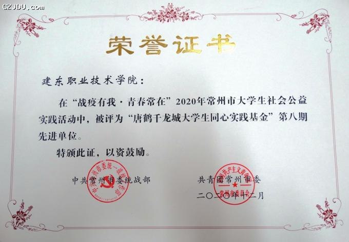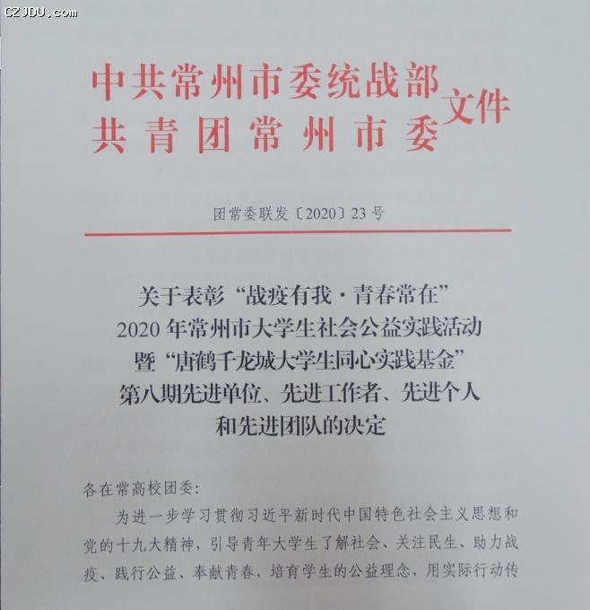 我院獲評(píng)“戰(zhàn)疫有我 青春常在”2020年常州市大學(xué)生社會(huì)公益實(shí)踐活動(dòng)暨“唐鶴千龍城大學(xué)生同心實(shí)踐基金”先進(jìn)單位