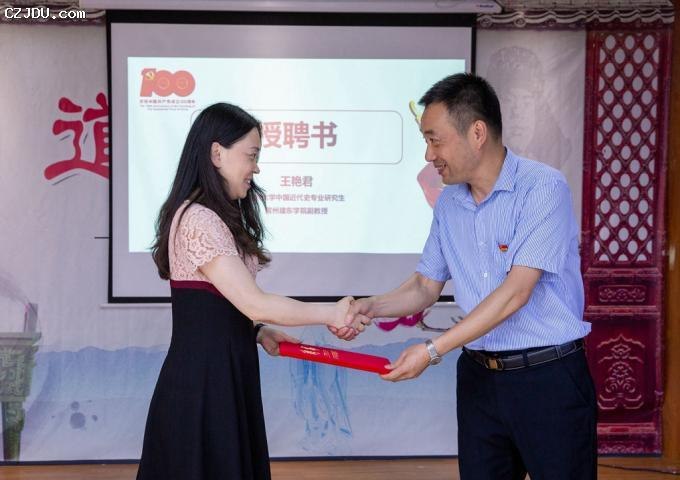 江灣社區(qū)黨支部書記楊永明向王艷君老師頒發(fā)志愿宣講員聘書