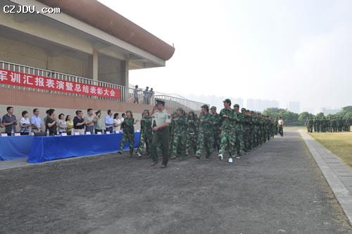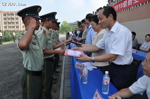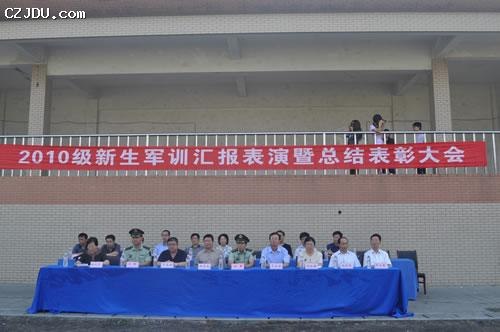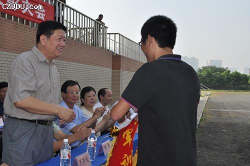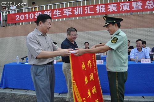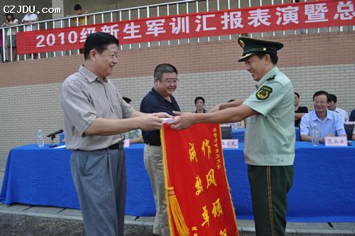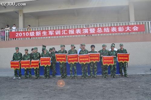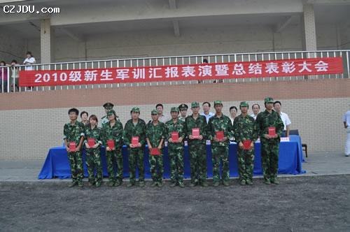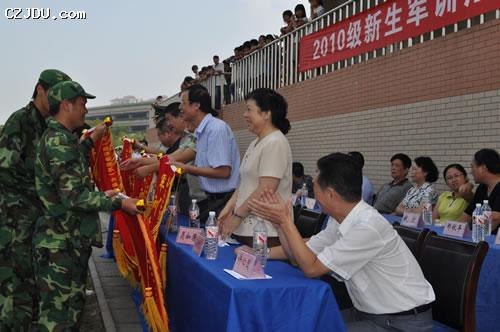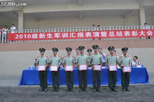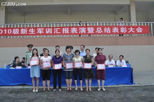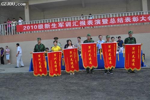 表演結(jié)束后,副院長吳如漪宣讀了我院《關(guān)于表彰2010級新生軍訓(xùn)先進(jìn)集體及個人的決定》。1個先進(jìn)營、6個先進(jìn)連隊、30個衛(wèi)生文明宿舍、7名優(yōu)秀教官、7名優(yōu)秀輔導(dǎo)員、96名軍訓(xùn)積極分子受到了表彰。在歡快的樂曲聲中,主席臺前排領(lǐng)導(dǎo)為軍訓(xùn)先進(jìn)集體和優(yōu)秀個人頒獎并合影留念。院長王榮成、副院長丁高明還向部隊授予了錦旗。