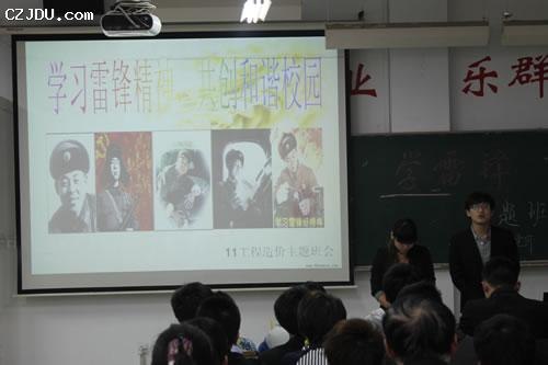 值紀(jì)念雷鋒同志犧牲50周年之際,根據(jù)教育部發(fā)布的《中共中央辦公廳關(guān)于深入開展學(xué)雷鋒活動的意見》及《省委教育工委省教育廳關(guān)于在全省教育系統(tǒng)深入持久開展學(xué)雷鋒活動的通知》(蘇教社政〔2012〕4號)的精神和總體要求,我院積極貫徹黨的教育方針,深入推進(jìn)社會主義核心價(jià)值體系建設(shè),進(jìn)一步加強(qiáng)和改進(jìn)大學(xué)生思想政治教育。4月25日在J102多媒體教室我院開展“學(xué)習(xí)雷鋒事跡,弘揚(yáng)雷鋒精神” 主題班會競賽活動。