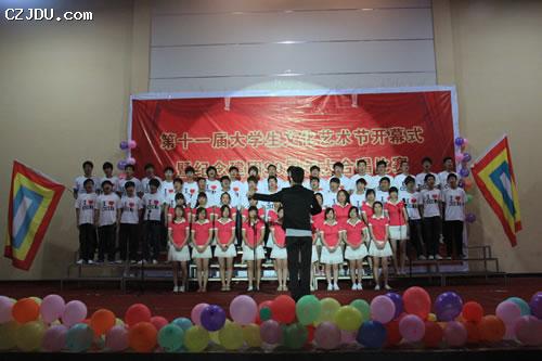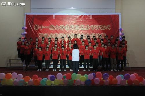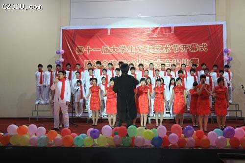 學院各系共10支代表隊參加了本次比賽。比賽在主持人激情洋溢的開場白中拉開了序幕。緊接著,一支支大合唱隊伍在歌頌祖國的震撼音樂下,在報告廳里用青春的激情唱響了一曲曲贊歌,用飽滿的熱情抒發(fā)了強烈的愛國愛黨愛團的情懷。