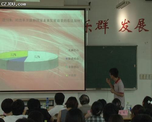 2012年5月17日下午4時“尋找身邊的改革開放成果”主題演講會在多媒體教室J108舉行。演講會由吳柏桐、祁高揚、蔣愛美三位同學作為主發(fā)言人,分別從三個角度闡述了對身邊的改革開放成果的調研心得。吳柏桐同學對改革開放前后衣食住行用等方面進行今昔對比、憶苦思甜,幽默風趣的語言和表情引來陣陣會心的笑聲;祁高揚同學對改革開放成果問卷調研活動進行了匯報總結,用數(shù)據(jù)說理令人信服,嚴謹?shù)难芯繎B(tài)度和深入的思考習慣,體現(xiàn)了我院大學生思想政治理論課研究性學習的教育效果;蔣愛美同學結合項目活動之一——天合光能企業(yè)參觀考察活動暢談感言,驚嘆于一家新能源企業(yè)在改革開放大背景下,在黨和政府政策支持下由小變大的發(fā)展歷程,并結合當代大學生嚴峻的就業(yè)形勢,理性分析現(xiàn)代企業(yè)對大學生的職業(yè)要求,告誡廣大同學敲響警鐘,盡早做好職業(yè)準備。