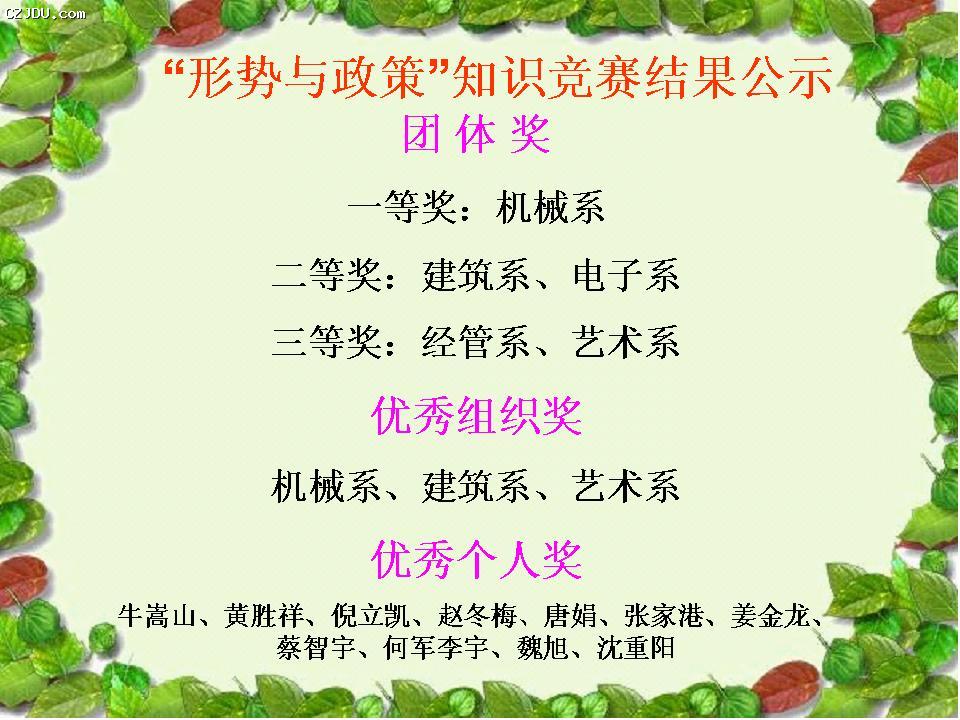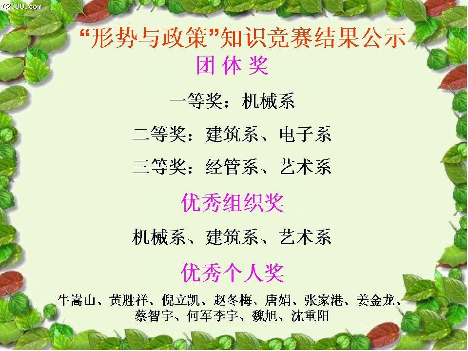 本次知識競賽的出題范圍以2014年發(fā)生的國際、國內熱點時事與政策為重點,以《時事報告(大學生版)》和《形勢與政策》(南京大學出版社)為參考教材,不僅考察學生《形勢與政策》課程理論內容的掌握程度,而且引導學生運用馬克思主義觀點方法去認識分析問題,如主觀題中對“殘疾人打車遭拒現(xiàn)象”、“大學生輟學生子現(xiàn)象”、“清華學神衍雋案例”、“中國好人尤輝案例”、“豪車搭訕與女大學生失蹤案”、“香港占中事件”等的評價引起了學生廣泛興趣與熱議,起到了很好的教育效果。