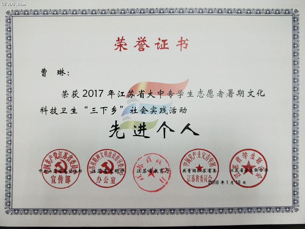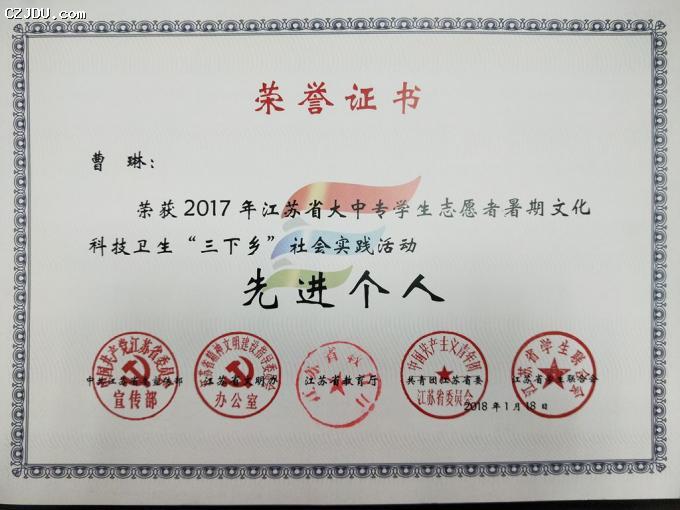 15級商務(wù)英語班學(xué)生曹琳榮獲“先進個人”榮譽稱號