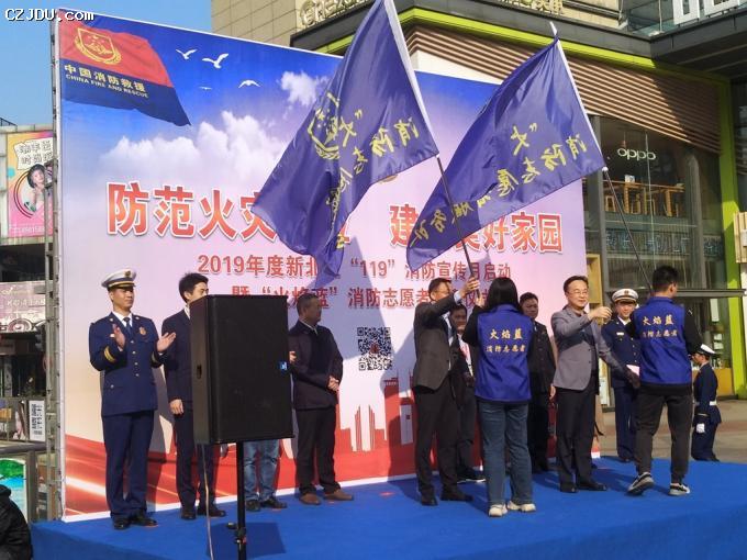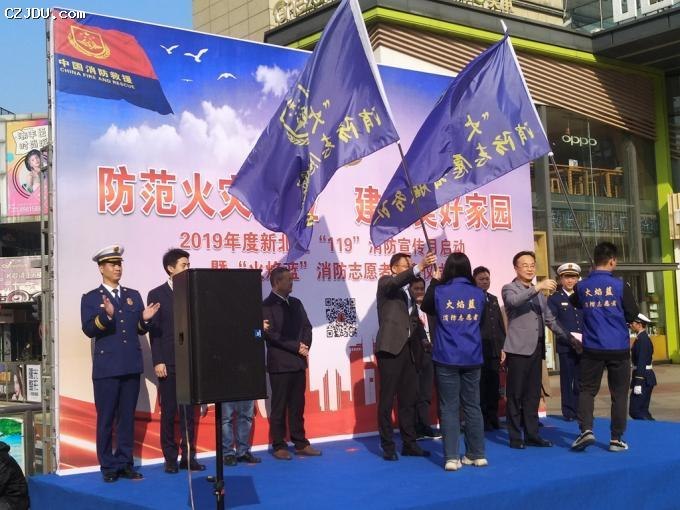 與會領(lǐng)導(dǎo)為“火焰藍(lán)”消防志愿者授旗
